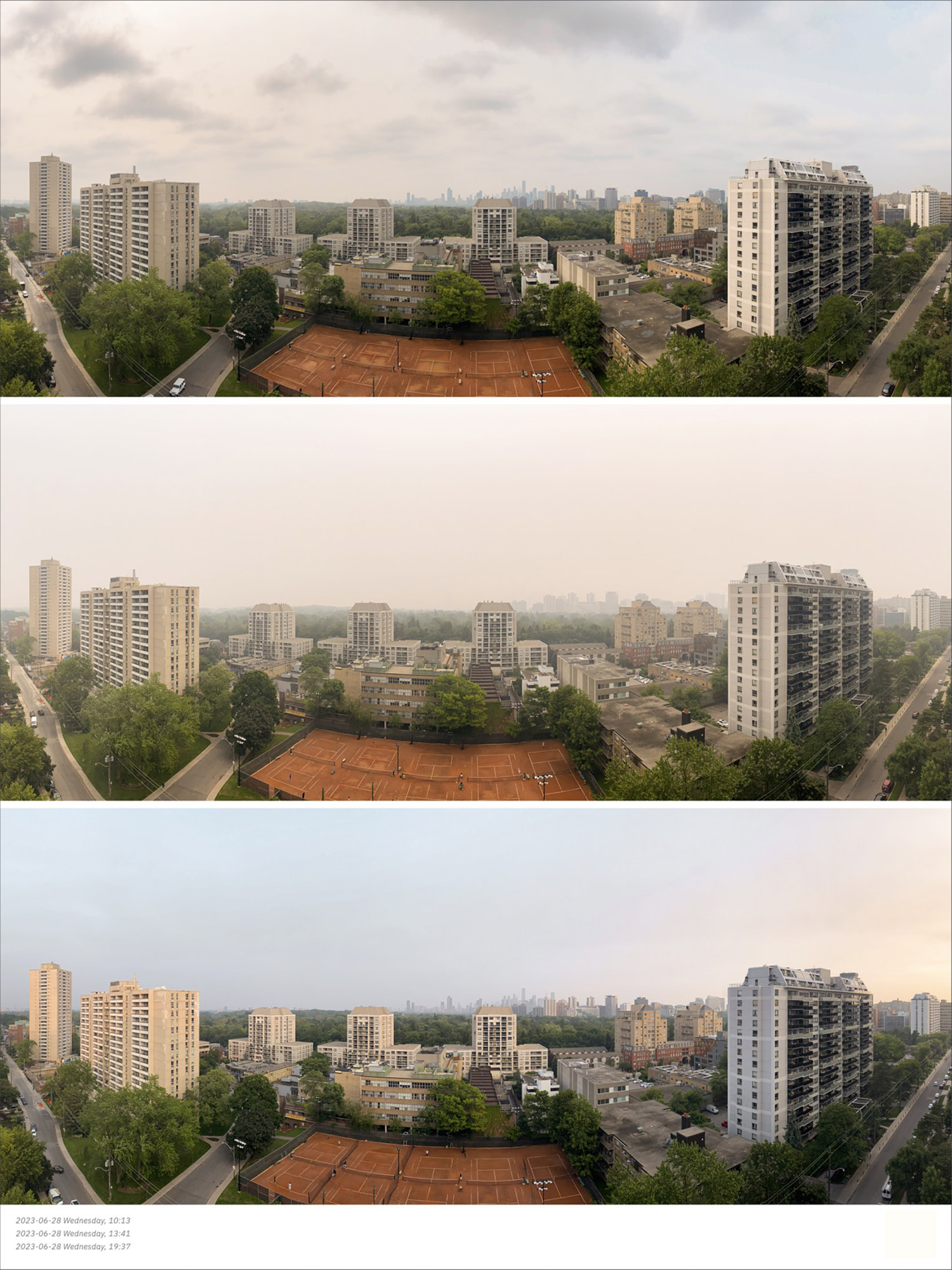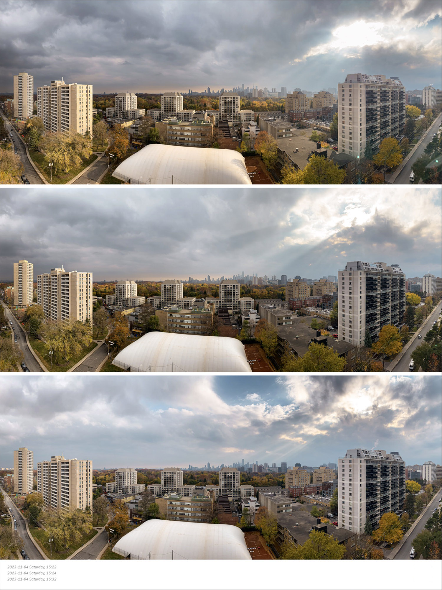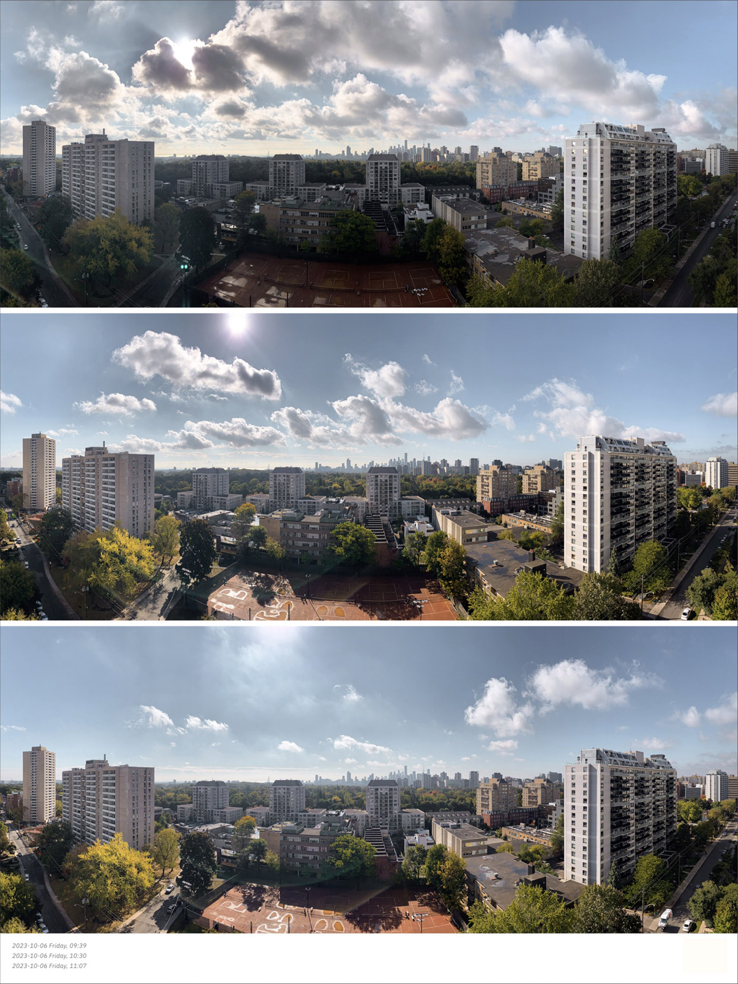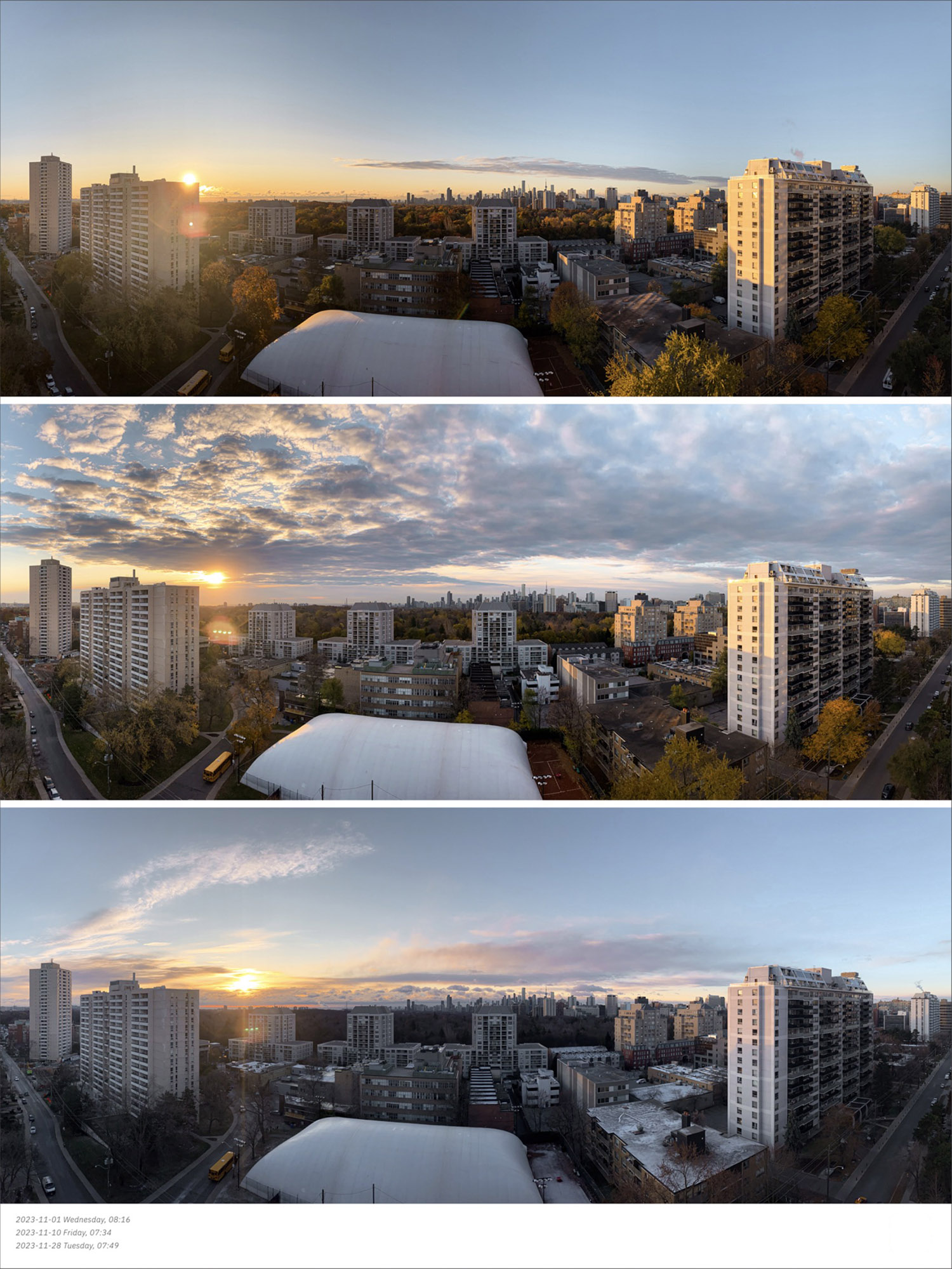 Midtown Light documents one year from a balcony in Davisville Village. The series features 40 panoramic sequences that showcase the neighbourhood's light, weather, and character throughout 2023. Soon, forty-story towers will replace the tennis court and low-rises below. This part of Midtown is about to change forever.